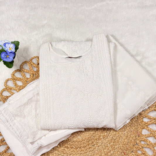 Ivory Heavy Schiffli Georgette Kurti Set with Dupatta | Stitched Suit