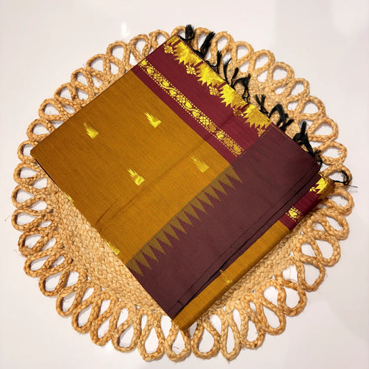 Women's Kalyani Cotton Tower Saree Mustard with Maroon Zari Temple Border