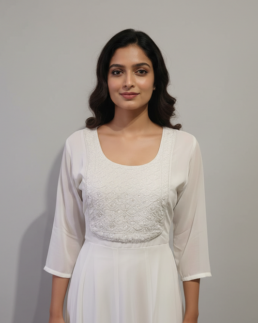 Women’s White Georgette Anarkali Kurti with Embroidered Yoke | Festive & Party Wear