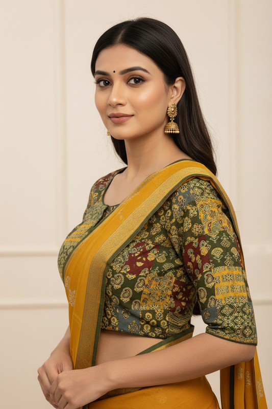 Ajrakh Patchwork Blouse – Elbow Sleeves | Cotton Printed | Round Neck | Front Hook