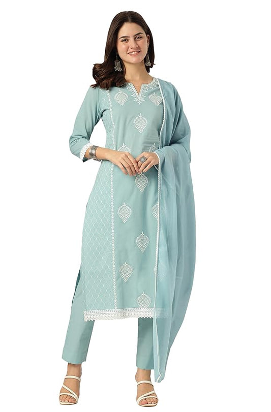 Women Light Blue Pure Cotton Embroidered Straight Kurta Set
