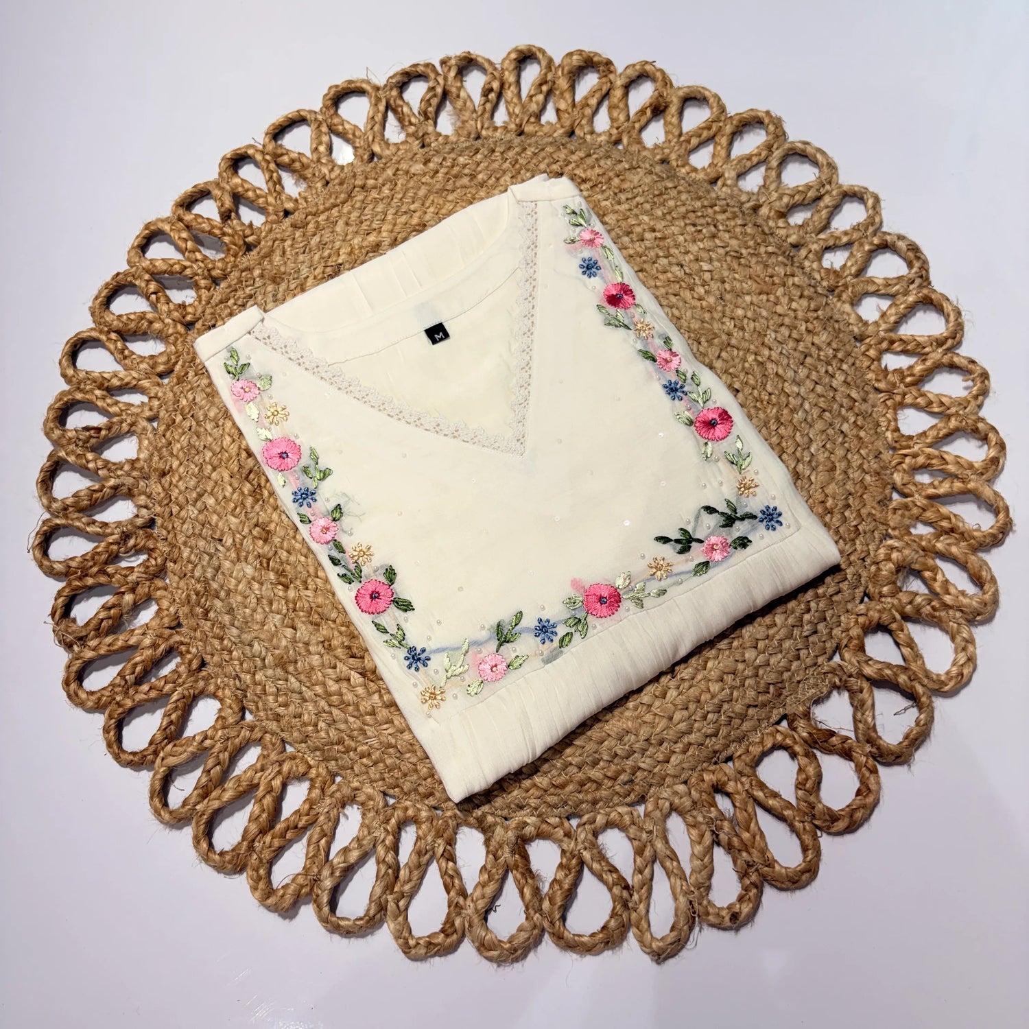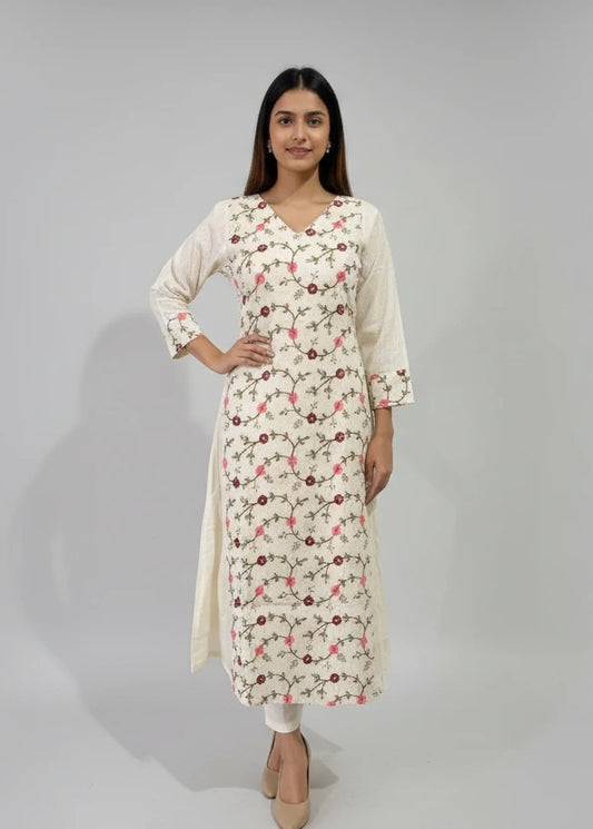 Women’s Off-White Hand-Embroidered Mul Chanderi Kurti with Lace Neck