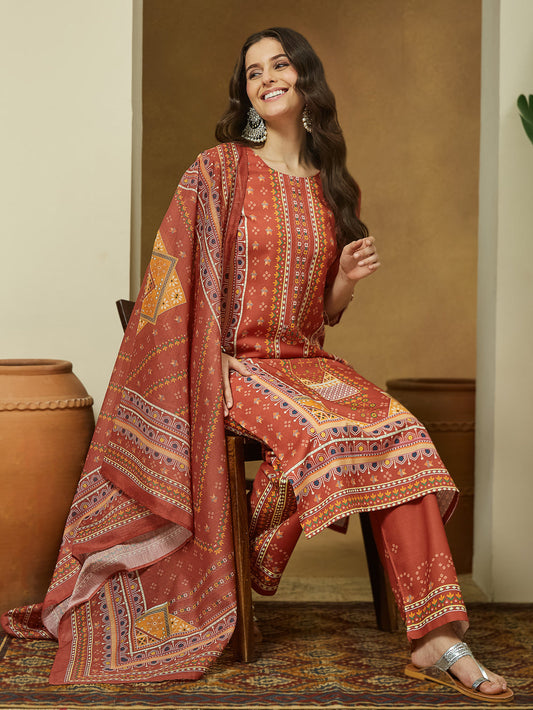 Women Rust Cotton Blend Ethnic Motif Printed Straight Kurta & Trouser With Dupatta