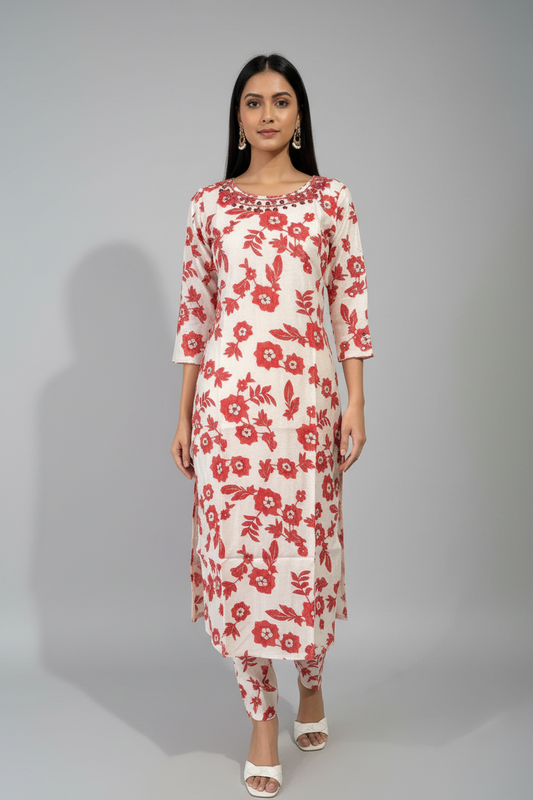 Women’s Off‑White Floral Kurti Cord Set with Elastic‑Waist Pant | Breathable Everyday Co‑ord