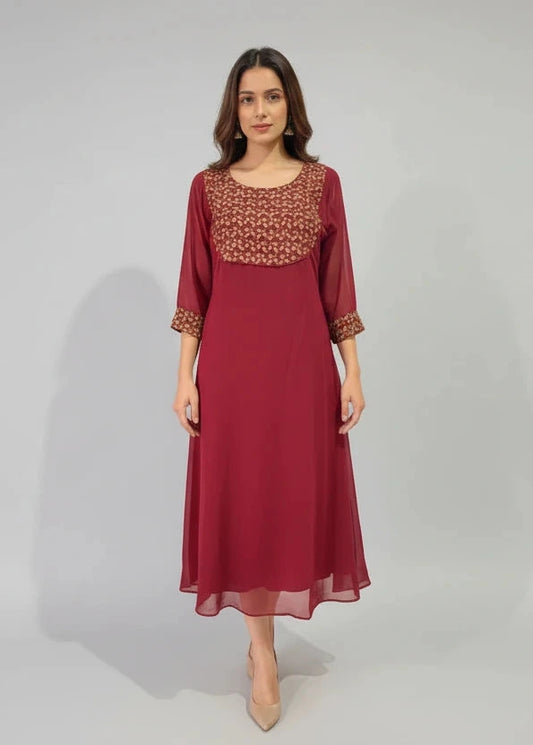 Womens Maroon Georgette Midi Dress with Embroidered Yoke & Sheer Sleeves