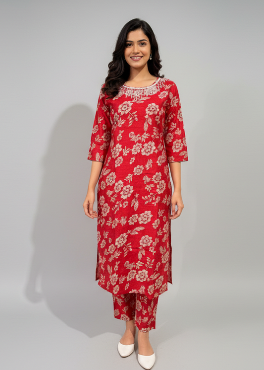 Womens Red Hand-Work Cord Set with Slit & Lining – Festive Co-Ord Set