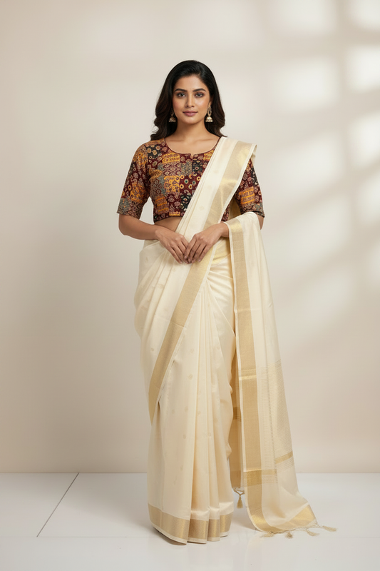 Off White Embroidery Saree with Floral Border – Elegant Festive & Office Wear Saree for Onam, Church & Special Occasions