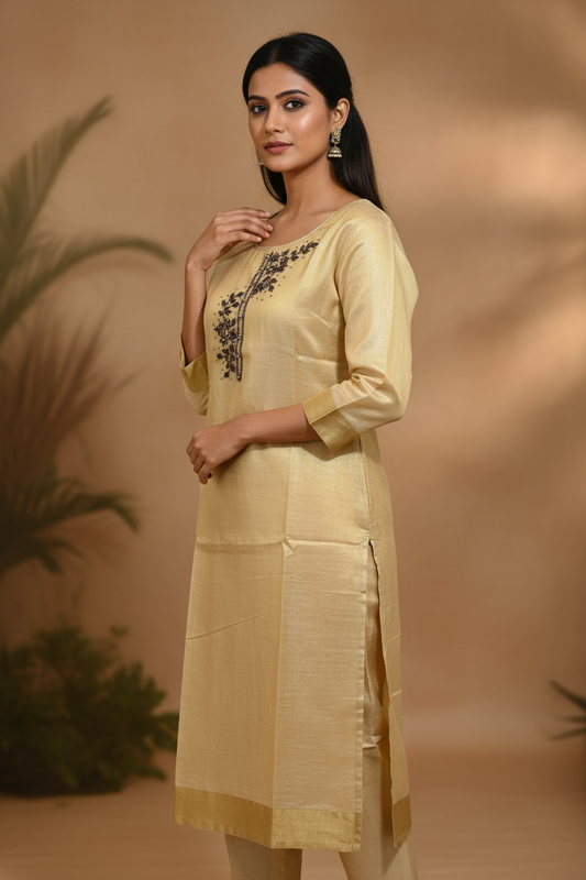 Champagne Gold Kerala Kasavu Tissue Kurti | Asymmetric Floral Vine Handwork | Keyhole Neck | Slitted Kurti