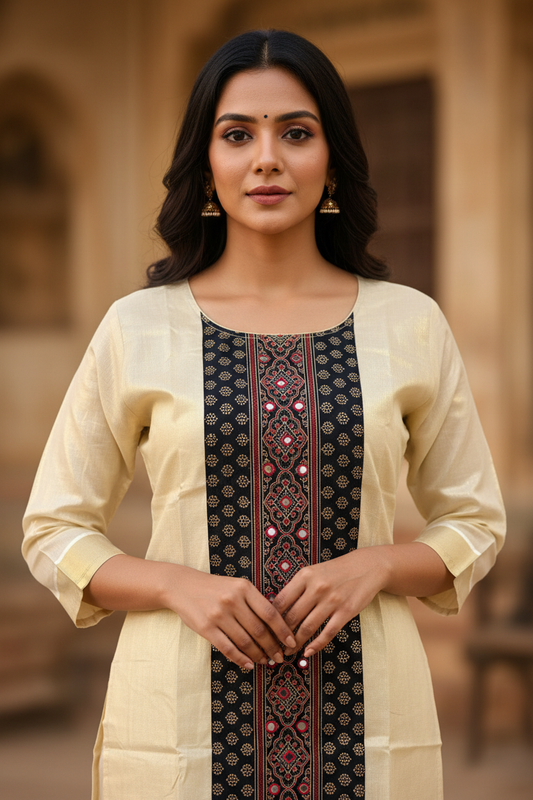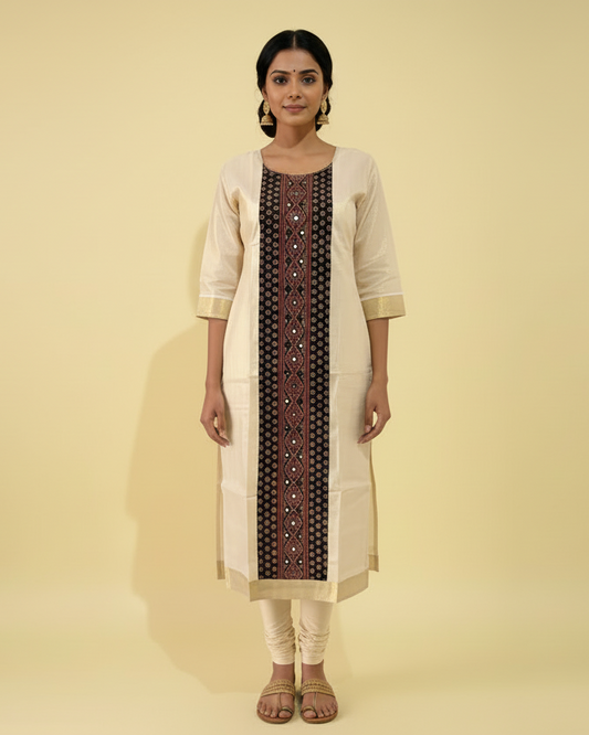 Cream Kerala Kasavu Tissue Kurti | Ajrakh Centre Panel with Mirror Work | Slitted Kurti