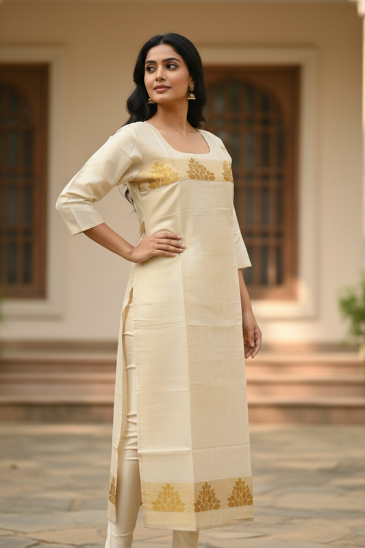 Cream Kerala Kasavu Tissue Kurti | Gold Zari Leaf Kasavu Woven Yoke & Hem Border | Slitted Kurti