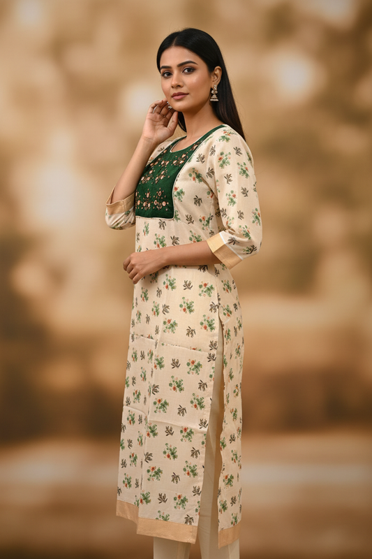 Cream Floral Digital Print Kerala Kasavu Tissue Kurti | Dark Green Mirror Work Yoke Patchwork | Slitted Kurti
