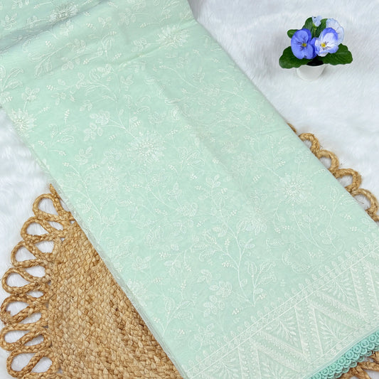 Women's Mint Green All‑Over Embroidered Saree with Blouse Piece | Tonal Floral Work, Chevron Border & Lace Edge