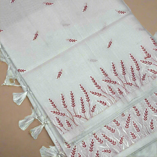 Women's White & Red Wheat Embroidery Design Saree With Un-Stiched Blouse