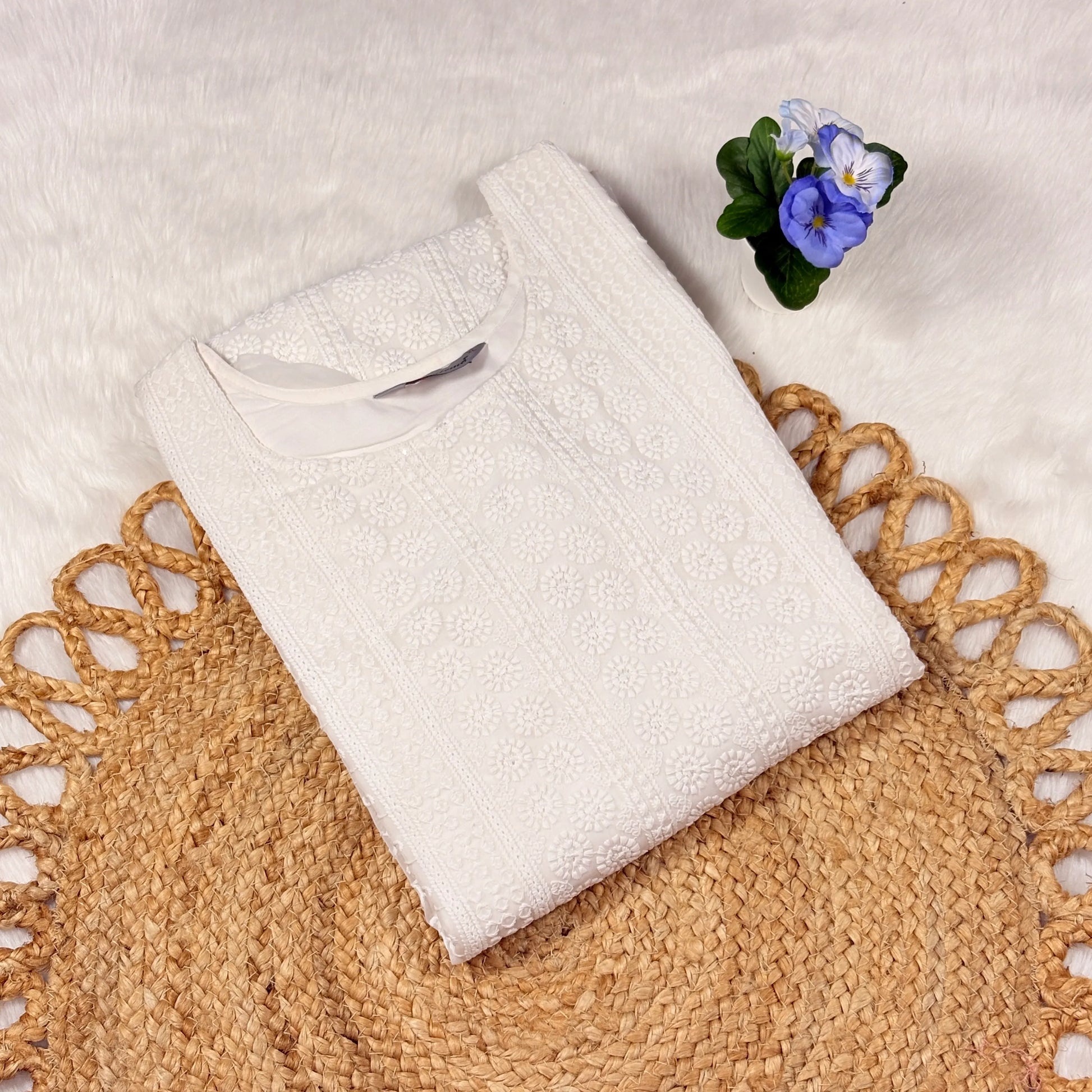 Ivory Heavy Schiffli Georgette Kurti Set with Dupatta | Stitched Suit