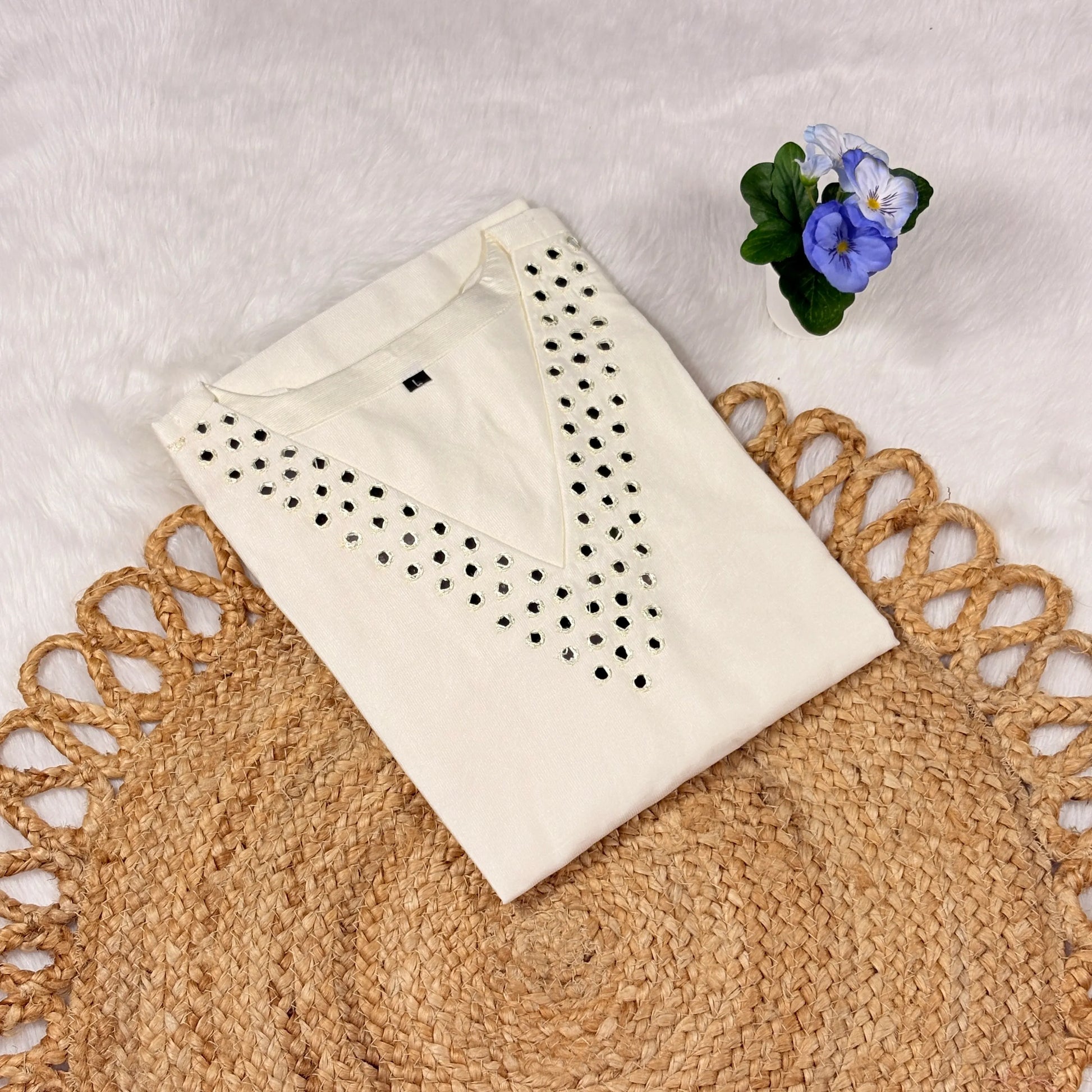 Women’s Cream Cotton Kurti with Mirror Cut‑Work V‑Neck | Minimal Chic, Everyday Comfort