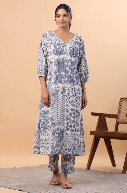 Upgrade your boring wardrobe to the latest trendy kurta set, where crochet lace details and stylized design are perfectly combined to uplift your occasional style. This Women's Off-White Cotton Tropical Regular Kurta Set features a charming V-neck and elegant balloon sleeves for a touch of sophistication. Paired with straight pants the stylish look is perfect for any occasion. Adore the style by adding minimal accessories to complete your ensemble, allowing the beauty of the set to shine through effortlessly.