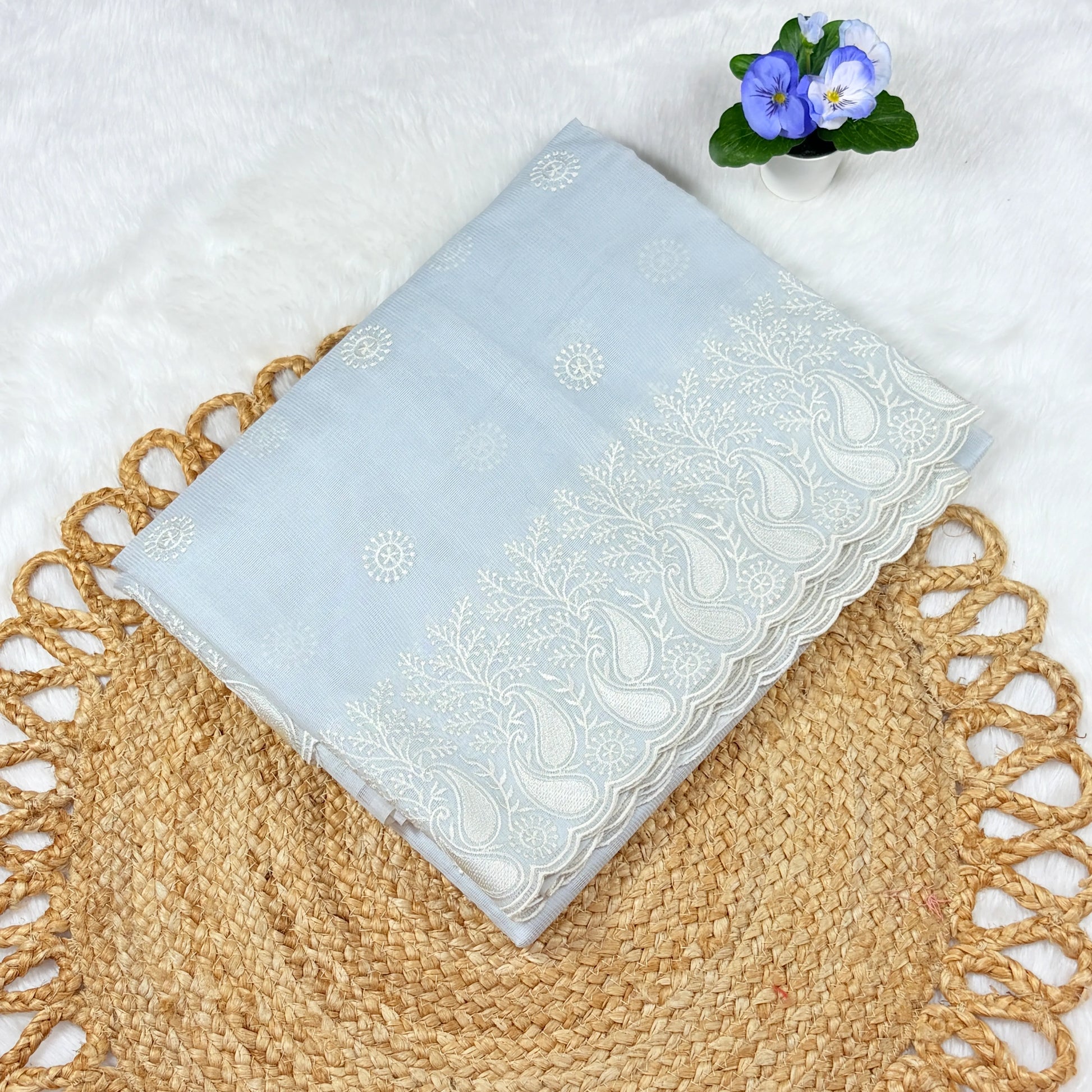 Women's Powder Blue Embroidered Saree with Blouse Piece | Medallion Bootis & Paisley‑Vine Scalloped Border