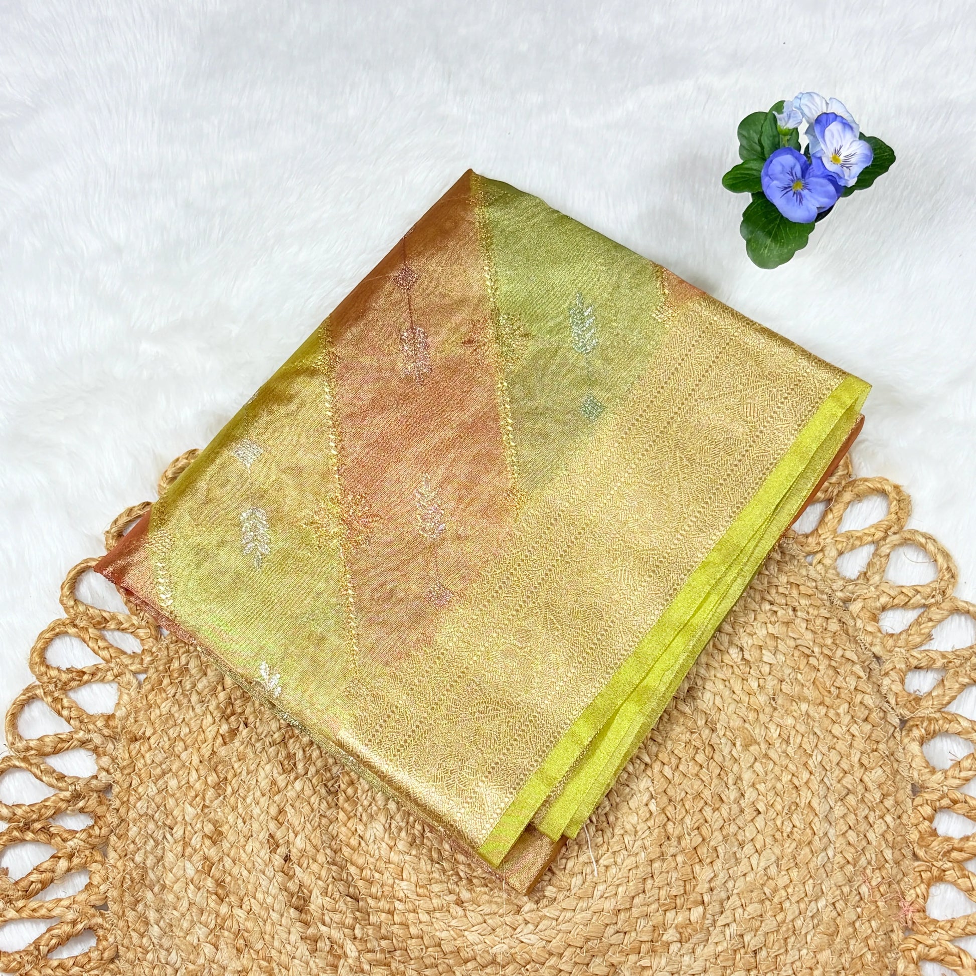 Color/finish: Gold‑green‑peach multicolor panels with shimmering tissue‑finish and zari detailing.
